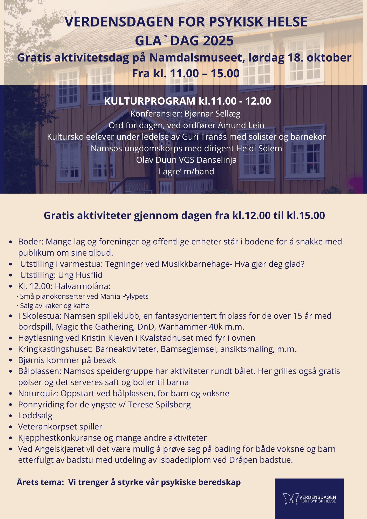 Gratis aktivitetsdag på Namdalsmuseet. Frivillige organisasjoner som driver med barn/ungdomsarbeid/ idrett/musikk i Namsos eller Namdalen ønsker velkommen til "Folkefest verdensdag psykisk helse" lørdag 18. oktober på Namdalsmuseet. Vi lager en fargerik dag for hele Namdalen, særlig for barn, ungdommer og familier. For tredje gang organiserer vi denne aktivitetsdag som samtidig reklamerer for frivillighet og for å gjøre meningsfulle ting sammen. Vi vil markere at psykisk helse er viktig for alle, og at alle kan bidra til dette.