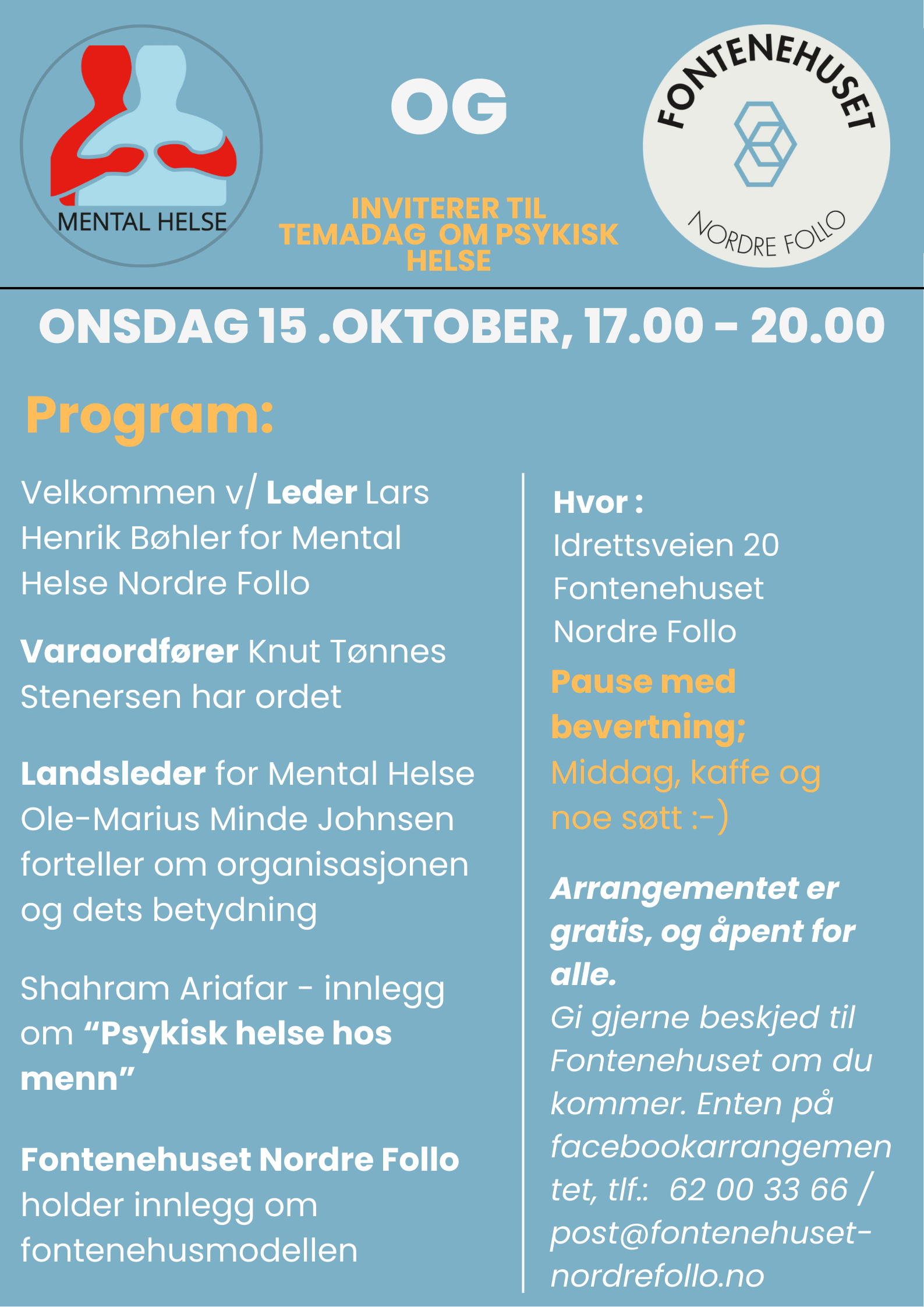 Mental Helse Nordre Follo og Fontenehuset Nordre Follo inviterer til temadag om psykisk helse. Dette blir en kveld med inspirasjon, gode samtaler og viktig kunnskap. Det blir pauser med bevertning: Middag, kaffe og noe søtt. Arrangementet er gratis og åpent for alle - vi håper å se mange der! Gi gjerne beskjed til Fontenehuset om du kommer. Enten ved å trykke 'skal' på facebook arrangementet, eller om du ønsker ved å sende en e-post til post@fontenehuset-nordrefollo.no.